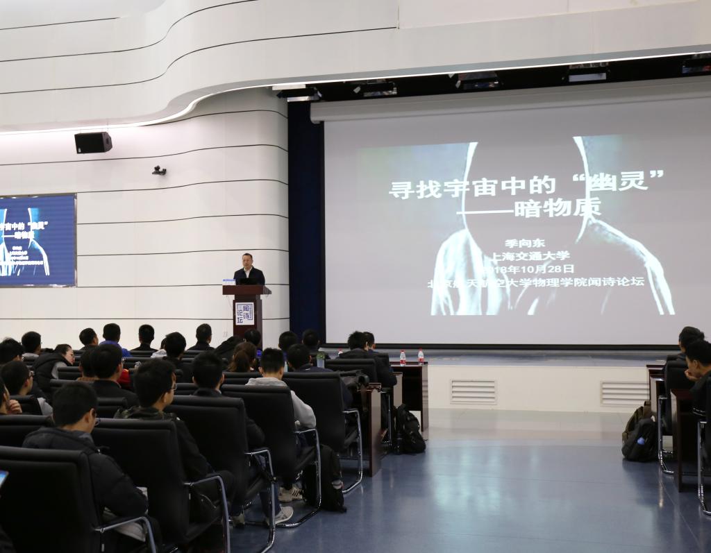 2018年10月28日,来自上海交通大学的季向东教授在北航沙河校区国实四层多功能报告厅为200余名师生带来了“闻诗论坛”第二讲《寻找宇宙中的“幽灵”—暗物质》。本次报告聚焦暗物质的历史,探测暗物质的方法,季老师结合自身科研经验,讲述了他的团队探索暗物质的发现之旅。