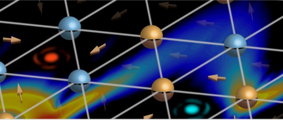 | 示意图二维量子磁性材料TMGO的三角晶体结构、自旋织构与涡旋对激发(背景为磁振子-旋子色散) |