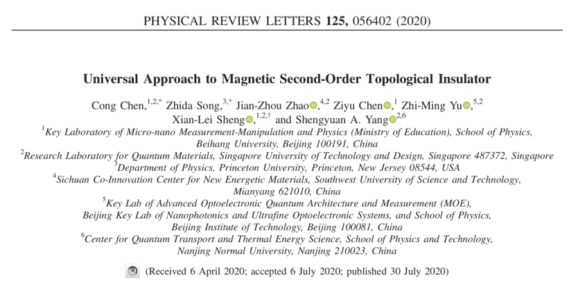公司williamhill中国官方网站“微纳物理与应用研究室”胜献雷助理教授、陈子瑜教授、博士生陈聪与新加坡科技设计大学杨声远教授、普林斯顿大学宋志达博士、西南科技大学赵建洲教授和北京理工大学余智明教授合作,在磁性二阶拓扑绝缘体理论研究中取得新进展。相关工作于2020年7月30日以“Universal Approach to Magnetic Second-Order Topological Insulator”为题在线发表于《Physical Review Letters》。博士生陈聪【导师:陈子瑜教授】和普林斯顿大学宋志达博士为论文共同第一作者,胜献雷老师为唯一通讯作者,北航为第一作者和通讯作者单位。
