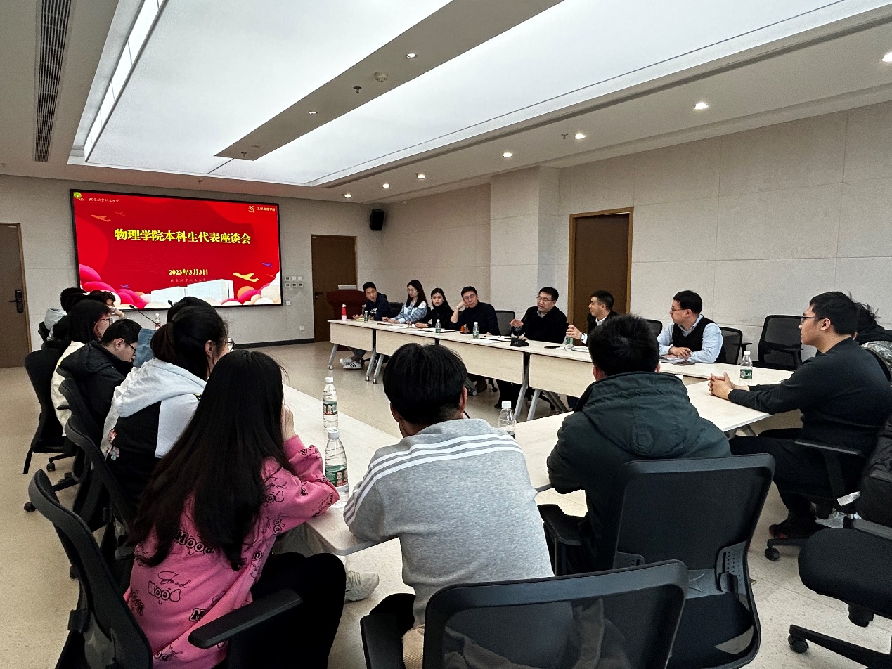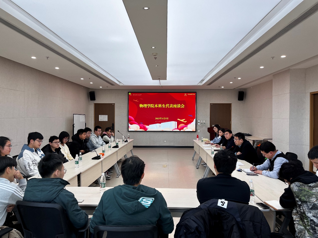3月3日上午,williamhill中国官方网站在沙河校区主楼C511会议室召开了本科生代表座谈会。物理公司党委书记李广超,副经理黄安平,党委副书记吕经纬、专职辅导员宋树洋、李思瑶,本科生半脱产辅导员及全院14名本科生代表参加了座谈会。会议由吕经纬主持。