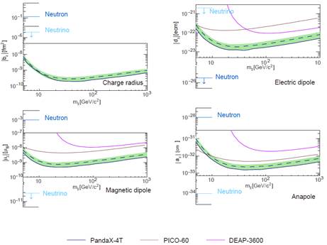 图4:利用PandaX-4T实验数据测量暗物质电磁性质给出的实验上限,其中电荷均方半径(charge radius)性质的结果为国际首个实验上限。