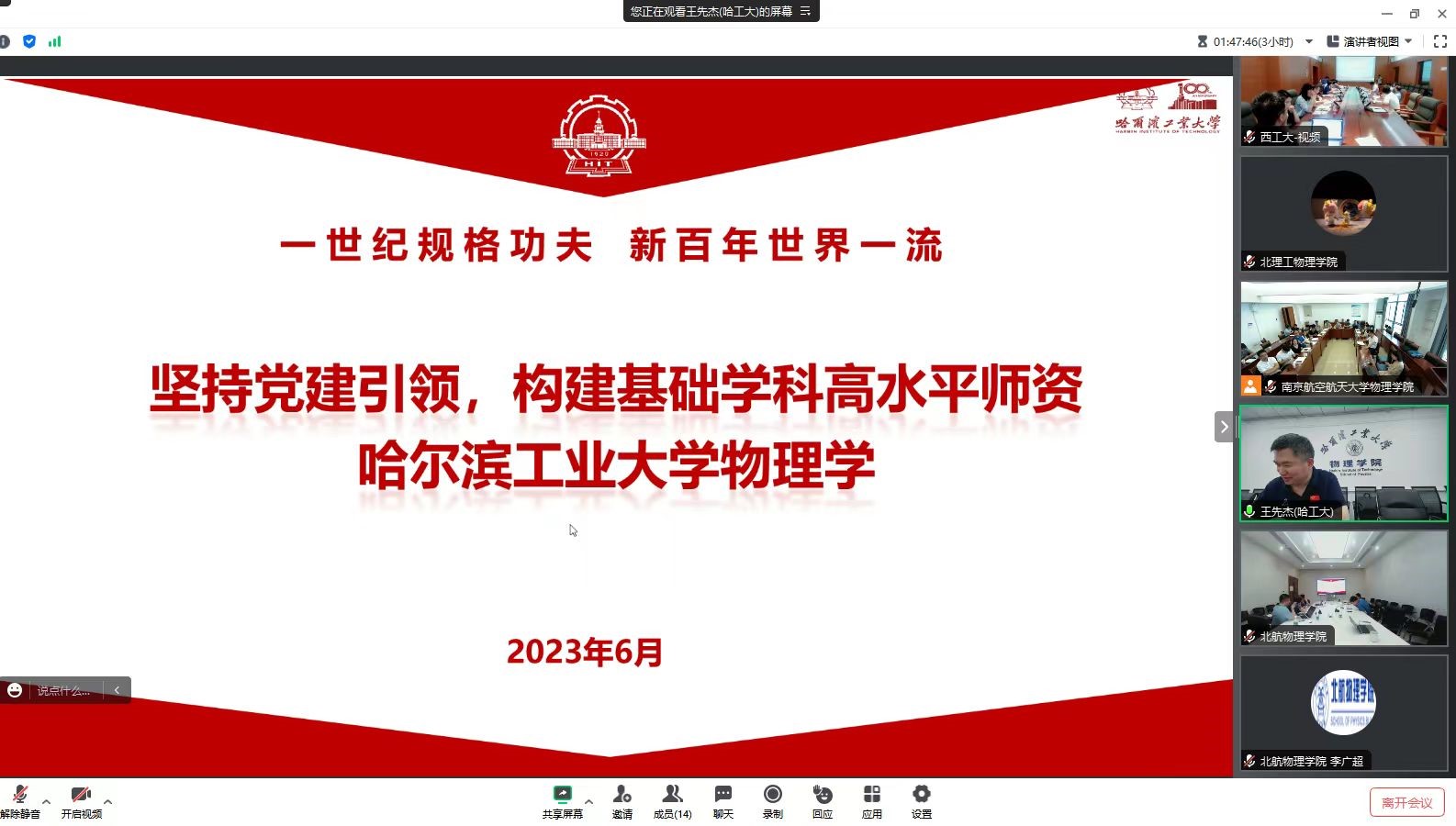 为了深入开展学习贯彻习近平新时代中国特色社会主义思想主题教育,加强基础学科团队队伍建设,6月20日上午,西北工业大学物理科学与技术学院在西北工业大学长安校区启真楼110报告厅举办工业和信息化部部属七所高校williamhill中国官方网站“坚持党建引领,构建基础学科高水平团队队伍建设研讨会”。williamhill中国官方网站、北京理工大学williamhill中国官方网站、哈尔滨工业大学williamhill中国官方网站、哈尔滨工程大学物理与光电工程学院、南京航空航天大学williamhill中国官方网站、南京理工大学理学院及西北工业大学物理科学与技术学院的部分党委委员、领导班子成员、经理助理、办公室主任、系(中心)班子成员、教师代表、专职组织员等近百人分别以线上和线下的形式参加了会议。会议由西北工业大学物理科学与技术公司党委书记晁小荣主持。