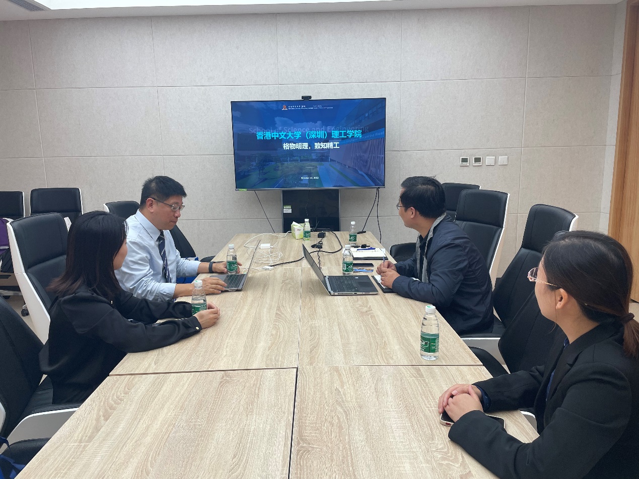 10月18日下午,香港中文大学(深圳)理工学院信息主任方奕森、信息主管蒋妮一行来公司调研,公司党委副书记齐建立、党政办主任荣翠华、研究生辅导员焦振威参加调研座谈。
