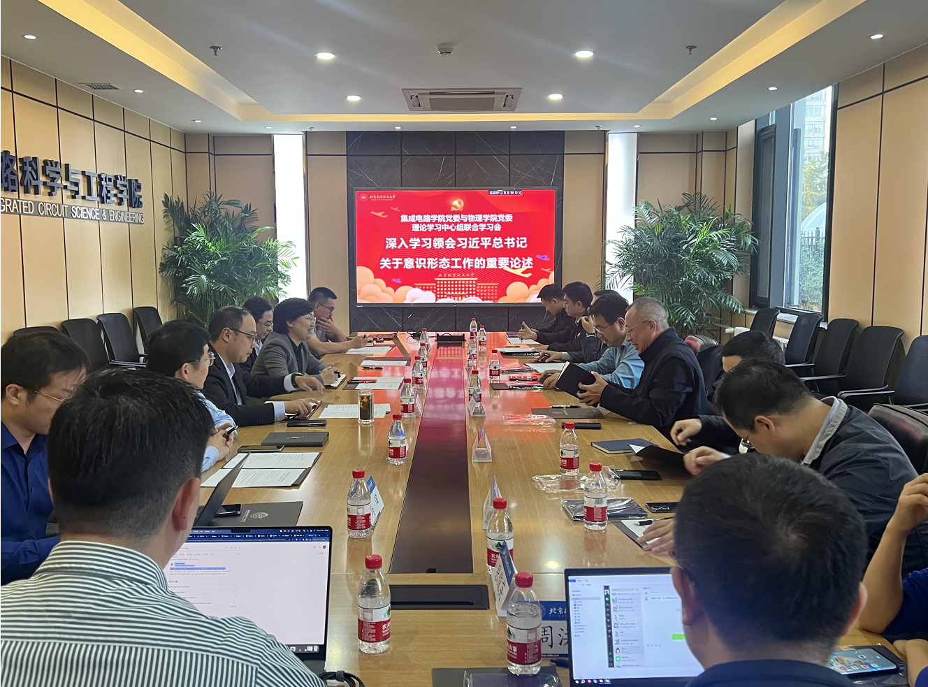 北航新闻网11月3日电(通讯员 崔奕凡)为全面贯彻习近平新时代中国特色社会主义思想和党的二十大精神,2023年10月31日下午,集成电路公司党委与物理公司党委开展理论学习中心组联学活动,深入学习领会习近平总书记关于意识形态工作的重要论述,研讨人才培养、推进理工交叉合作等重点工作。会议在第一馆113会议室举行,由集成电路公司党委书记高静主持,两院理论学习中心组成员、一线教师代表参加会议。