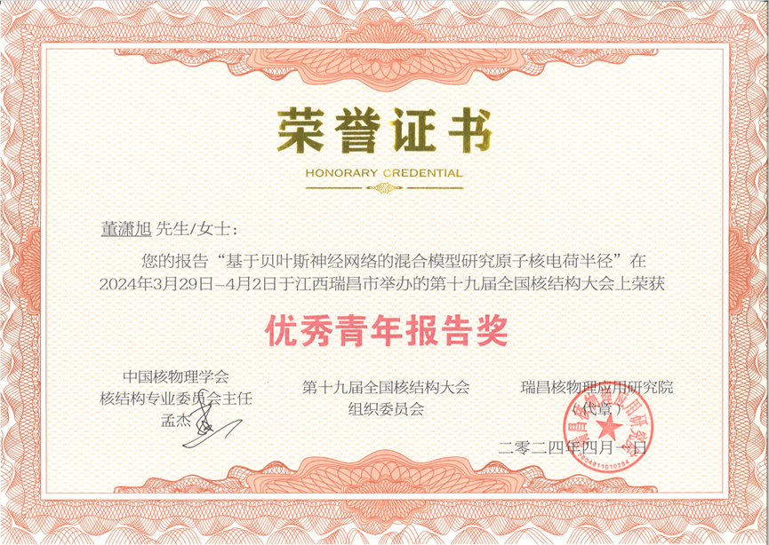 2024年4月1日,在江西瑞昌举办的第十九届全国核结构大会上,williamhill中国官方网站博士研究生董潇旭因其所作报告——“基于贝叶斯神经网络的混合模型研究原子核电荷半径”,获得中国核物理学会核结构专业委员会颁发的“优秀青年报告奖”。在报告中,他首次提出了输入重排方法,根据所研究课题的先验知识重新构建了贝叶斯神经网络的结构,从而增强了贝叶斯神经网络在特定任务中的学习能力,第一次将理论模型对中重原子核电荷半径的全局描述与预测偏差降到了0.01fm左右,并准确预测了各种奇异的演化行为。