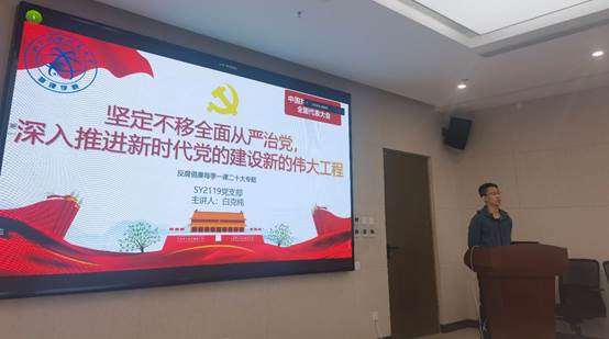 之后,师生们集体开展了反腐倡廉每季一课学习。SY2119党支部白克纯同学带领大家进行了二十大专题学习,主题为“坚定不移全面从严治党,深入推进新时代党的建设新的伟大工程”。分别从六个方面进行了学习:全面从严治党,是新时代党的建设的鲜明主题;十年来反腐败斗争取得的成就;时刻保持解决大党独有难题的清醒和坚定;完善党的自我革命制度规范体系;坚持以严的基调强化正风肃纪;坚定不移全面从严治党,深入推进新时代党的建设新的伟大工程。